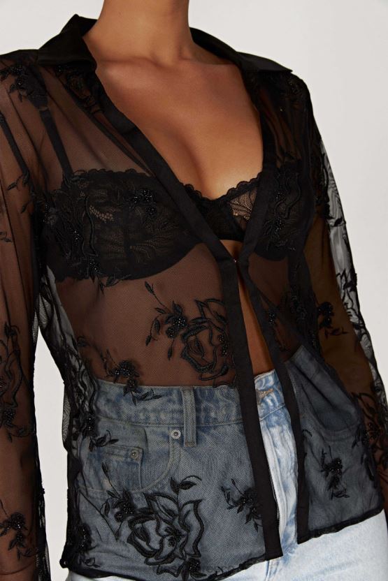 αυτό είναι ένα πουκάμισο από διχτυωτό κέντημα και χάντρες με σατέν πατιλέτα και λαιμόκοψη με γιακά. Φτιαγμένο με γάντζο και μάτι στο κέντρο μπροστινό περίβλημα, αυτό το πουκάμισο προσφέρει ομαλή εφαρμογή στο μπούστο, ενώ το διάφανο μακρυμάνικο ύφασμα τραβάει την προσοχή ακόμα και όταν είναι καλυμμένο. ταιριάξτε με τη μίνι φούστα μας με κεντητό διχτυωτό vivica ή τζιν meshki για να ολοκληρώσετε την εμφάνιση.